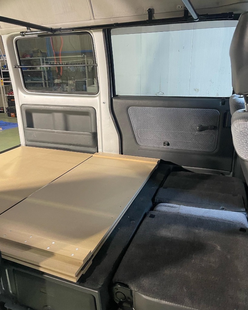 荷台をフルフラットになるように木材を加工、取り付け。折り畳み式にしたので座席も活用できます。
